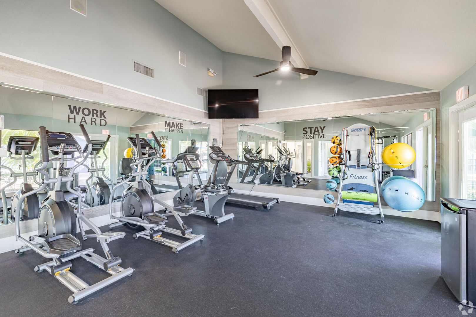 scenes of poolside lounging, mornings in the fitness center, friendly matches